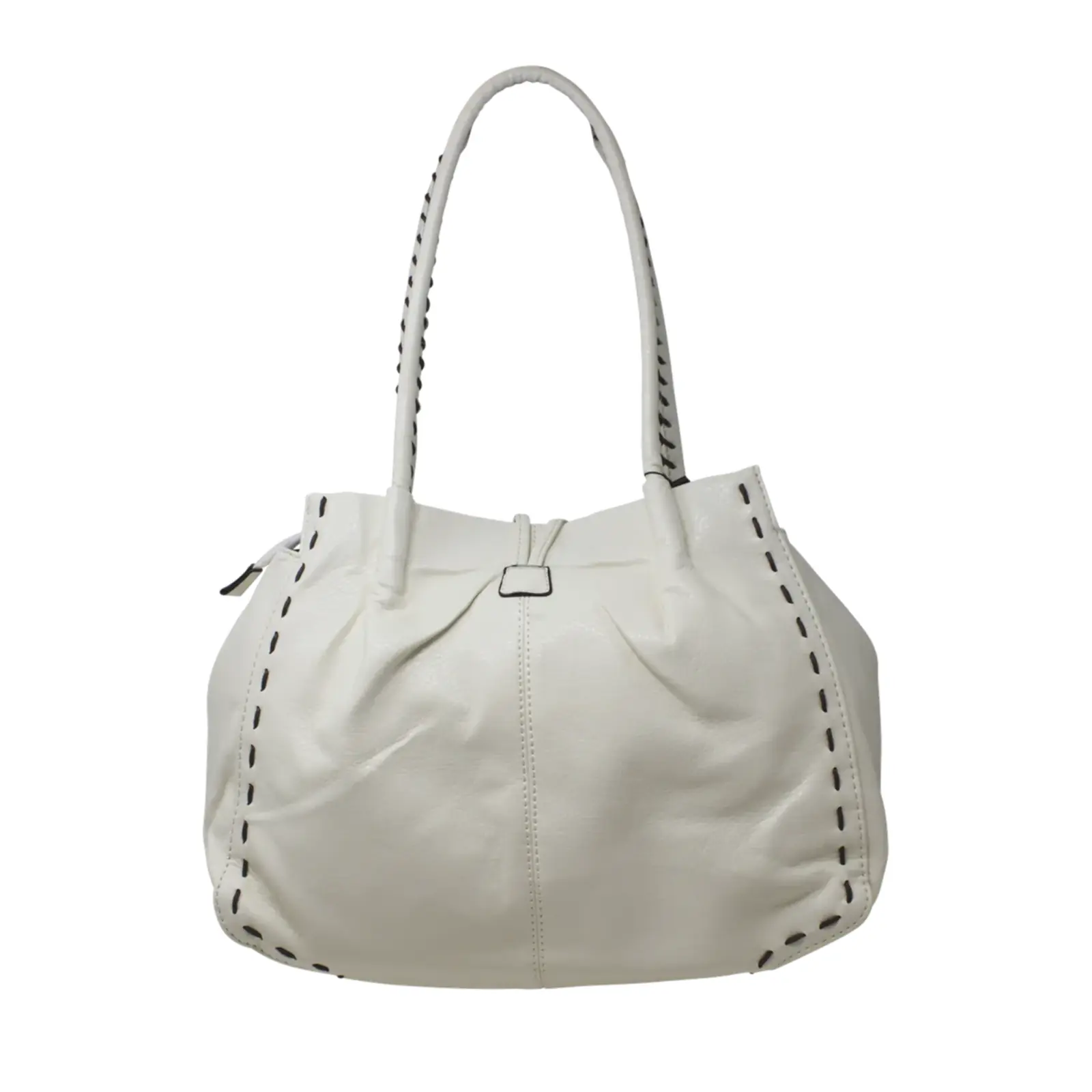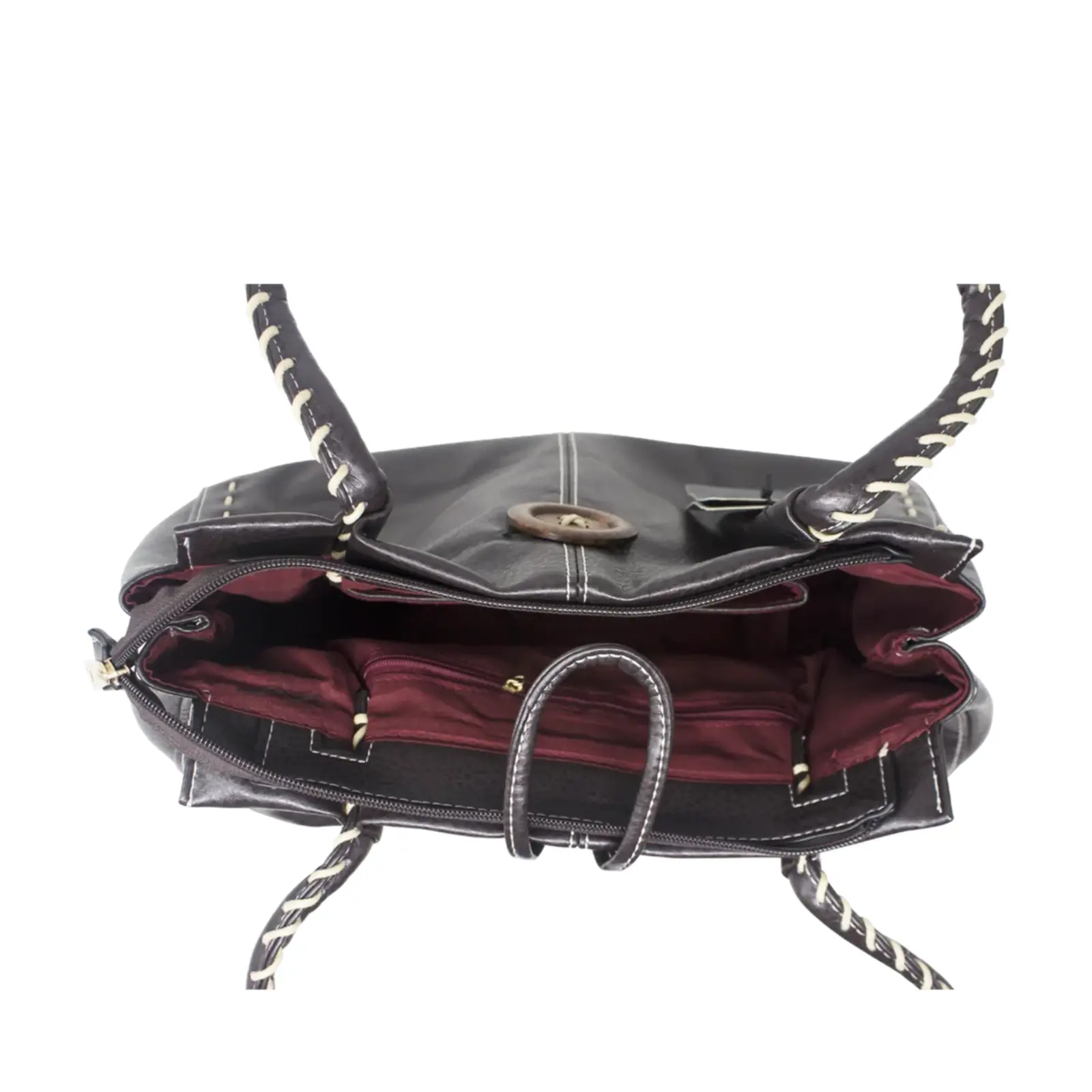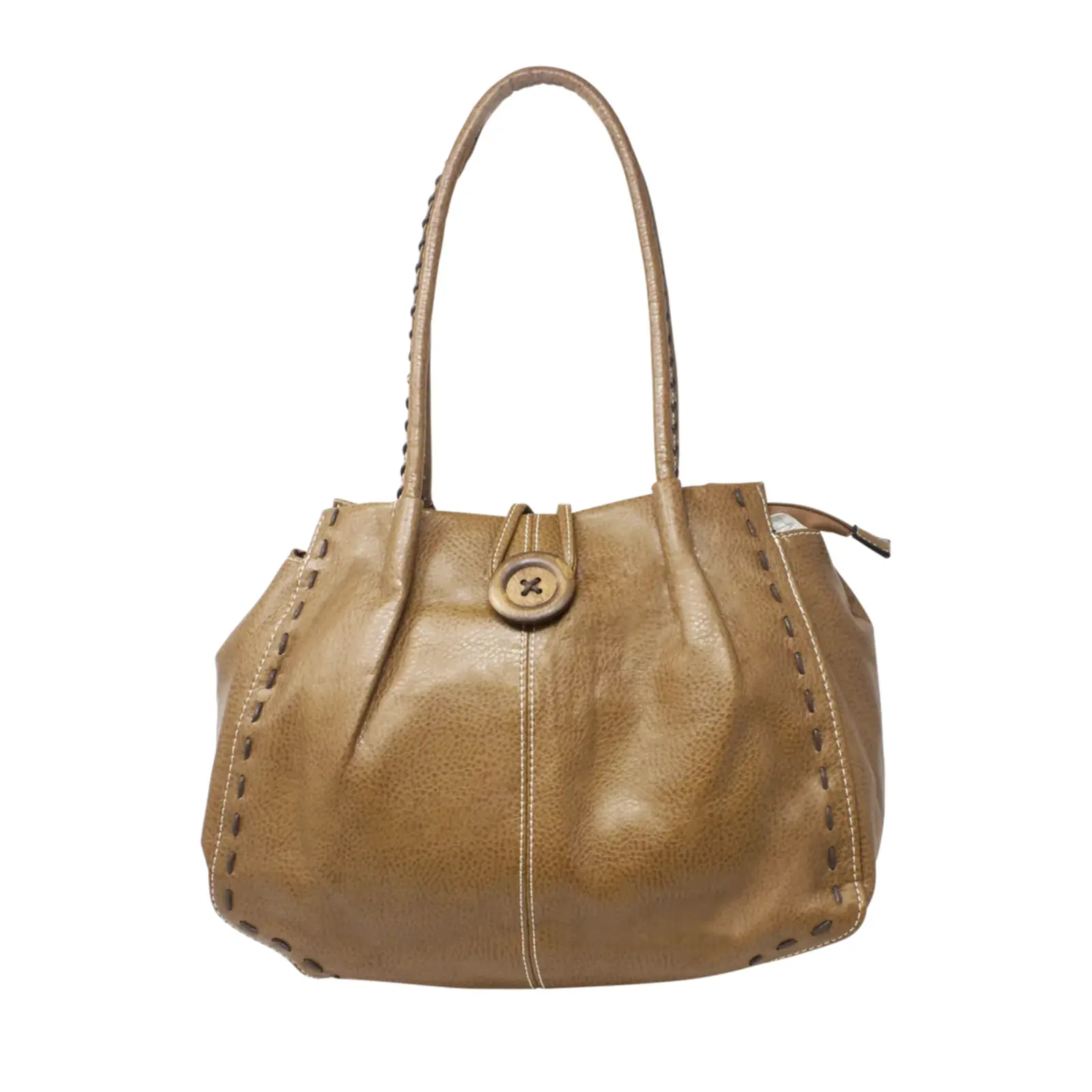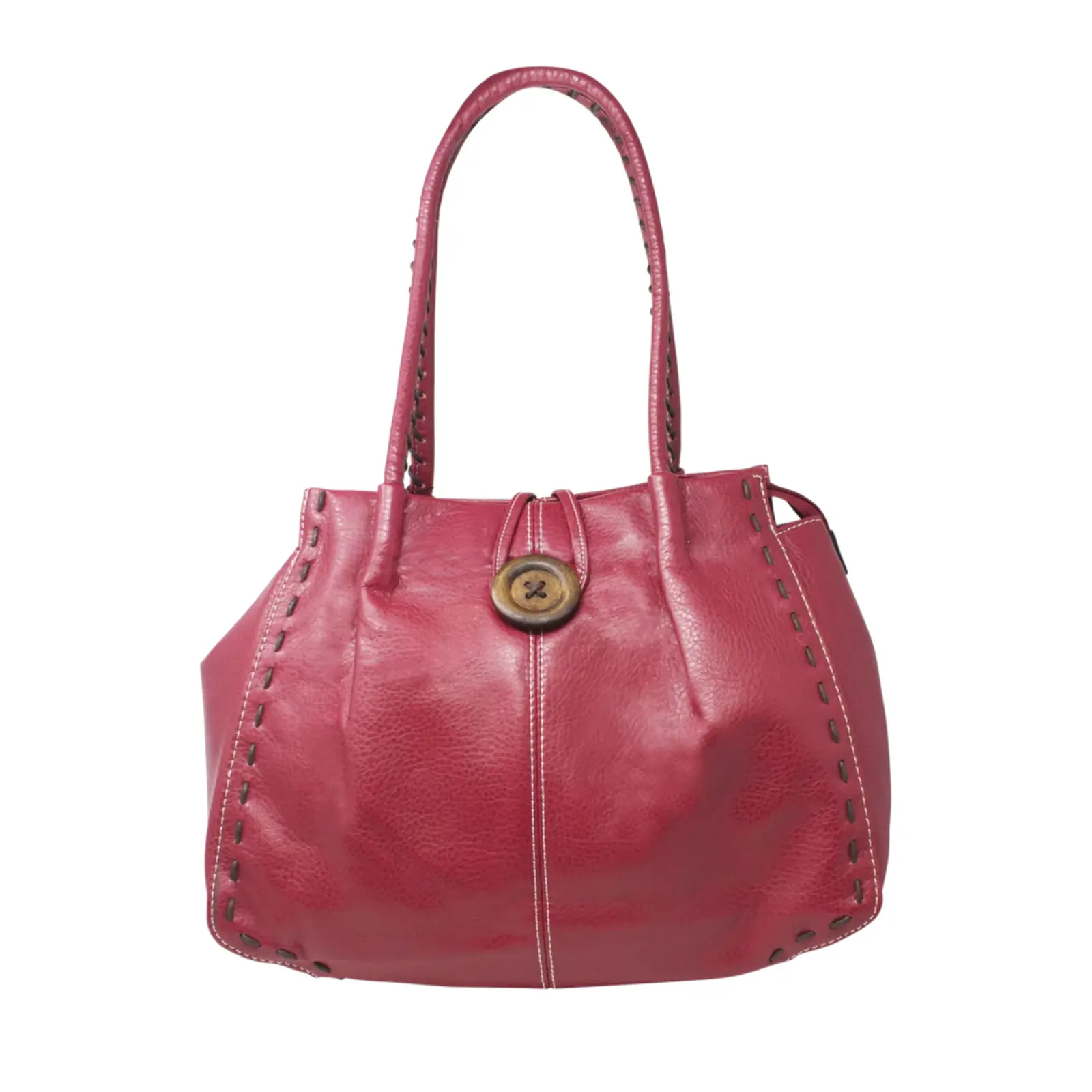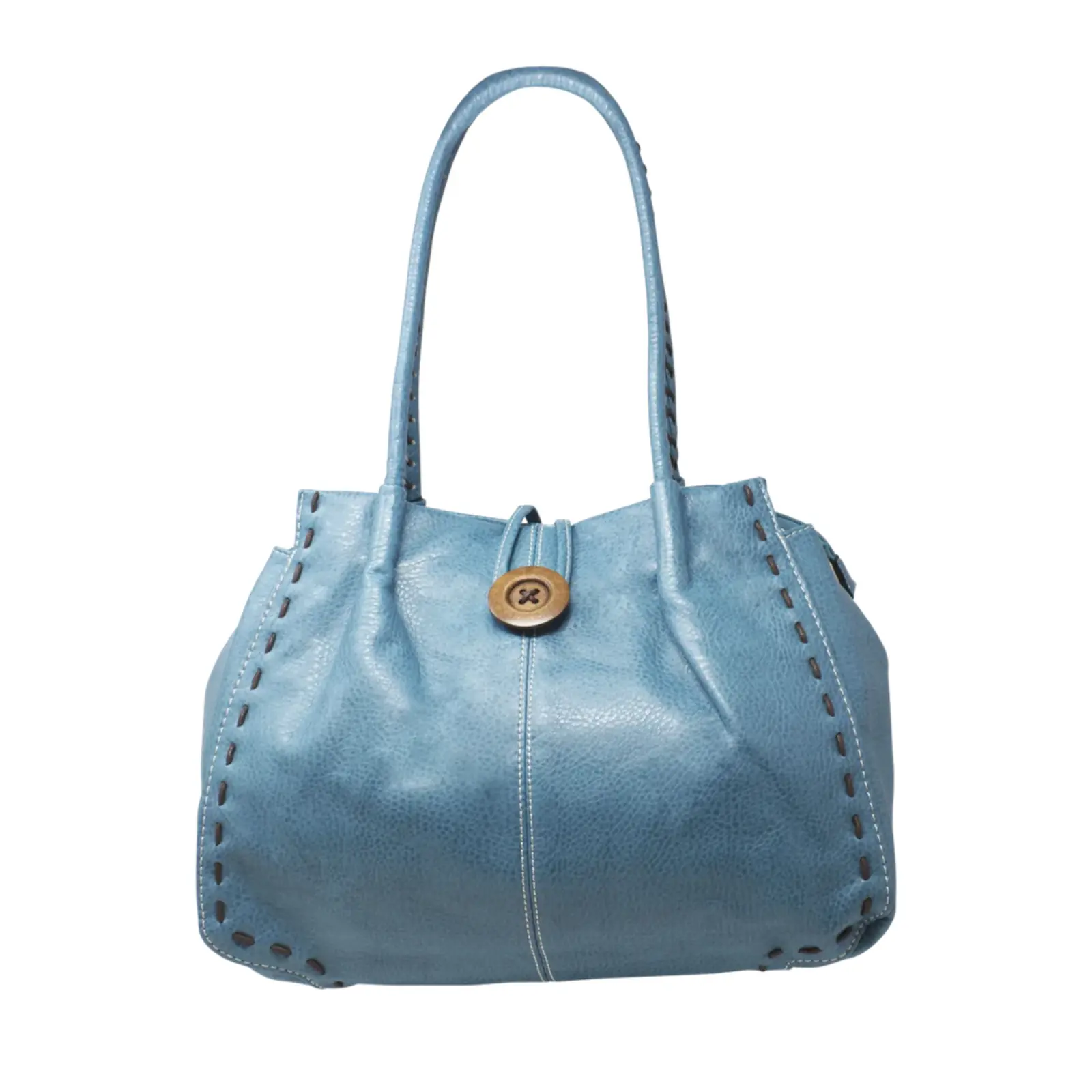 This is a tote bag that features a wooden button with stitched lines at the front also it is large enough to hold everything you need for every day use. Perfect for daily occasion or traveling.